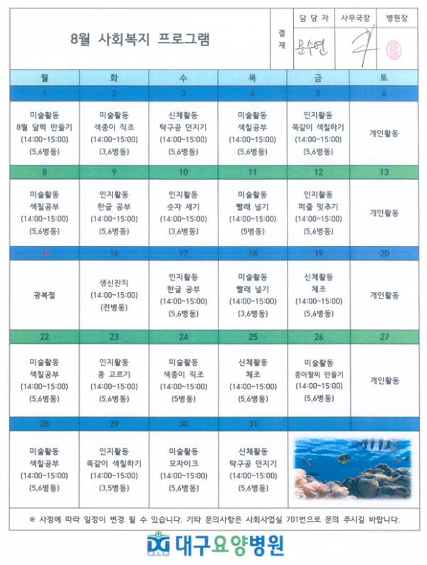 2022년 8월 사회복지 프로그램 안내입니다. 페이지 정보 작성자 관리자 작성일22-08-05 13:53 조회3,777회 댓글0건 관련링크 이전글 다음글 목록 본문 안녕하세요, 대구요양병원입니다^^8월 프로그램 일정표를 안내드립니다~어르신들의 즐거움을 위하여 열심히 준비하겠습니다.최근 코로나 재확산세를 보이고 있으니건강에 유념하시길 바랍니다~감사합니다, 항상 건강하세요^^ 이전글 다음글 목록